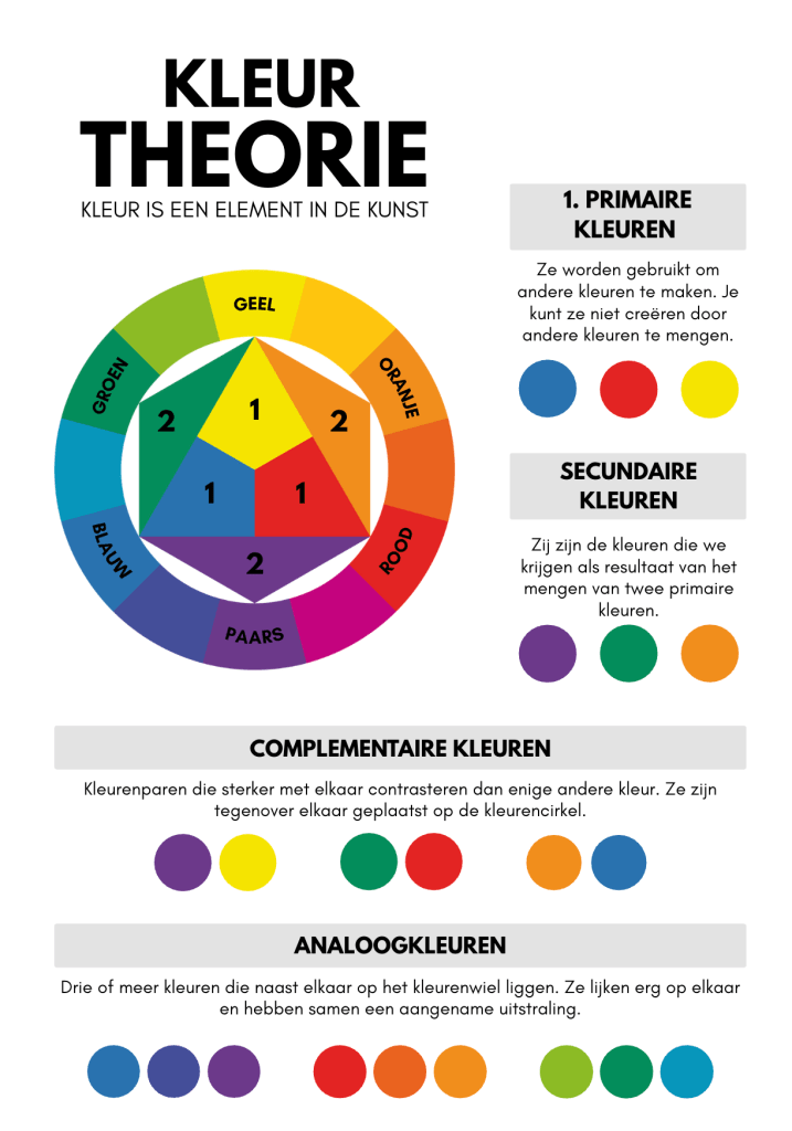 | Primaire kleuren | Rood, geel, blauw | Basis van alle kleuren |