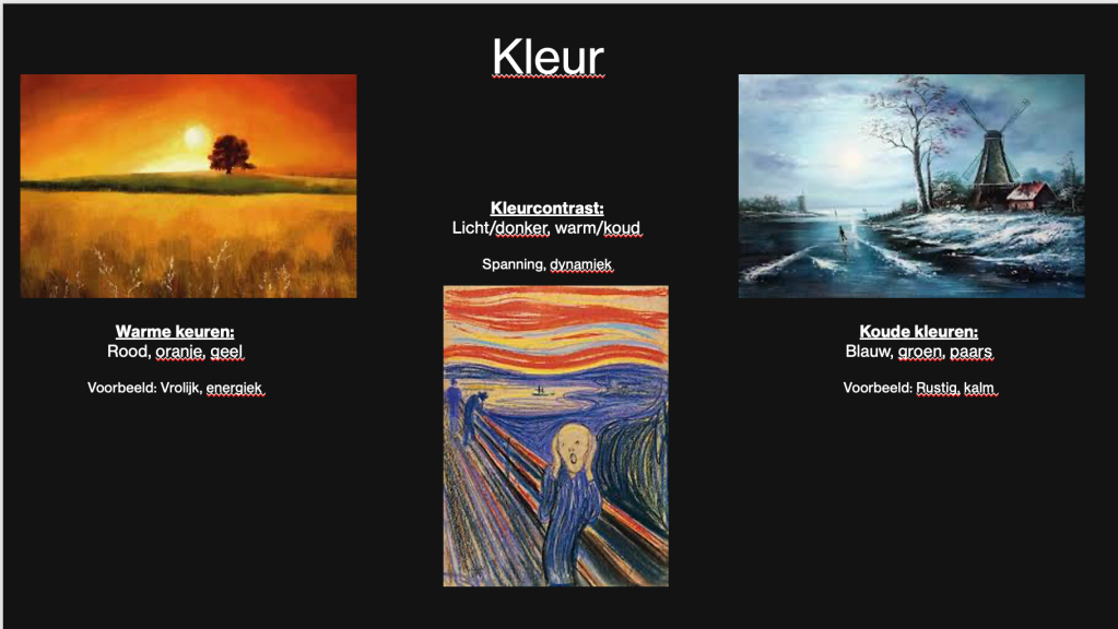 | Kleurcontrast | Licht/donker, warm/koud | Spanning, dynamiek |